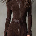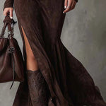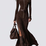 Dlouhé šaty Catarina vyzařují sílu a sofistikovanost v dokonalé harmonii. Vyrobeny z měkké tkaniny s semišovým vzhledem, tvarují postavu s hladkým zipovým předním dílem a splývavou sukní, která se pohybuje s každým krokem. Vysoký rozparek dodává nádech svůdnosti, zatímco odpovídající pásek stahuje pas pro rafinovanou, sebevědomou siluetu. Kombinujte je s vysokými botami a výraznou kabelkou pro vzhled, který je jak dominantní, tak nadčasový.