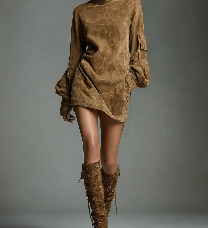 CATARINA - MINI ŠATY Z TMAVĚ HNĚDÉHO SEMIŠE S VYSOKÝM LÍMCEM