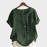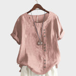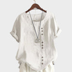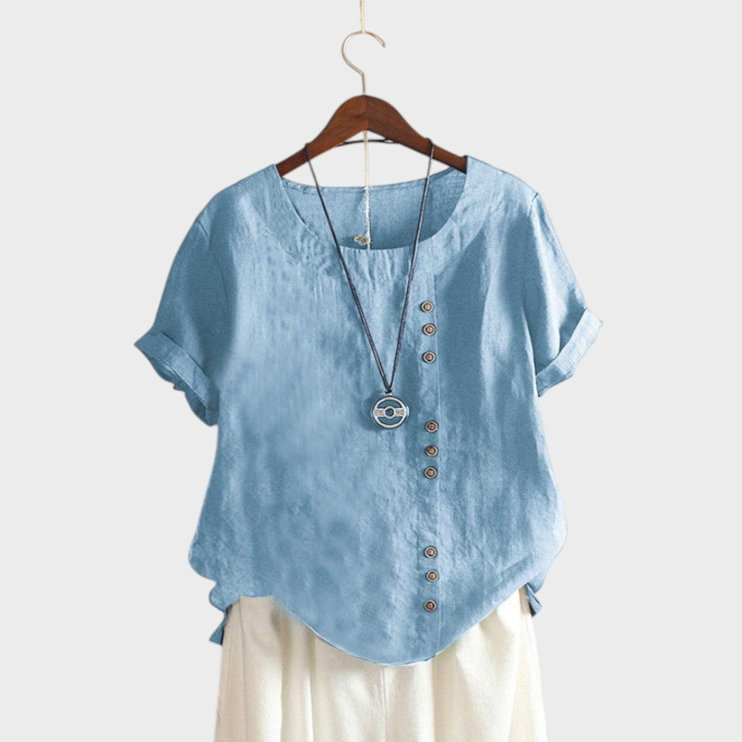 Tato blůza dokonale vyvažuje neformálnost a eleganci. Asymetrické uspořádání knoflíků jí dodává moderní a výrazný vzhled, zatímco lehký materiál zajišťuje prodyšnost a pohodlí po celý den. Je ideální pro každodenní kombinace, stejně jako pro zvláštní příležitosti, kdy chcete vypadat jinak a sofistikovaně.