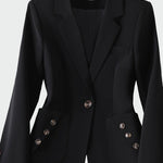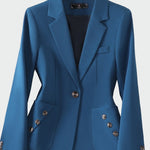 Impozantní blazer s ženským střihem, který vyniká elegantními detaily. Jediný knoflík vpředu dodává minimalistickou eleganci, zatímco dekorativní knoflíky na kapsách přinášejí moderní nádech. Ideální pro obchodní schůzky, ale také pro stylové večerní výlety.