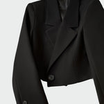 Minimalistický krátký blazer s elegantním designem a moderními detaily. Límec má ostré linie a přední zapínání dodává dynamický charakter, zatímco krátký střih ho činí ideálním pro stylové příležitosti. Snadno se nosí jak na pracovní, tak na večerní akce.
