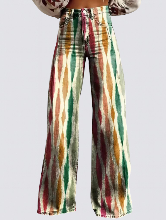 FRANCESCA Vintage Kalhoty · jsou pravým poctou odvážnému duchu 70. let. S výraznými, vícebarevnými pruhy a širokým střihem nohavic přinášejí retro energii a bezstarostný styl do každého okamžiku. Ideální pro ty, kteří se rádi odlišují.
