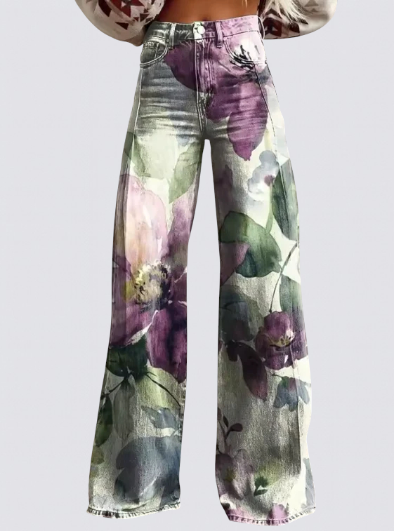 SOFIA Vintage Kalhoty 70. let · kombinují květinové umění s vintage stylem. Omyté tóny, převislé květy a bez námahy plynulý pohyb — prohlášení pro ty, kteří nosí sebevědomí jako svou značku.