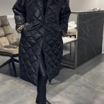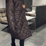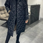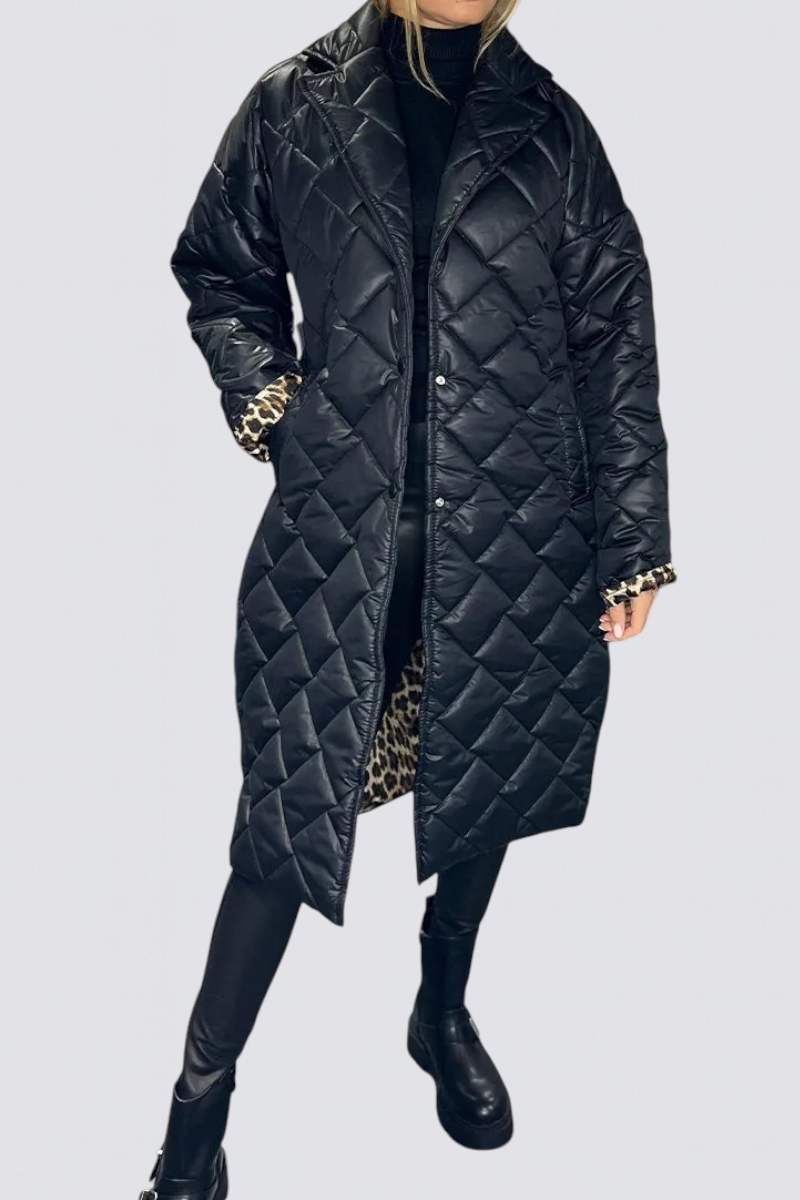 Otočný kabát Julia spojuje městskou sebevědomí s útulnou sofistikovaností. Textura s diamantovým prošíváním, podšívka s leopardím vzorem a uvolněný, ale přesto rafinovaný silueta — svrchní oděv, který říká mnohé, aniž by pronesl slovo.