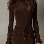 Šaty Catarina Midi ve tmavě hnědé barvě spojují sofistikovanost a pohodlí v dokonalé harmonii. Vyrobené z jemného semišového materiálu, tento model vyniká asymetrickým střihem, který přidává šatům jedinečný nádech. Elastický pás zvýrazňuje siluetu, zatímco volné rukávy s jemným volánem a detaily v podobě kvalitní kovové kabelky a kozaček podtrhují ženskost. Tento model je ideální volbou pro chladné dny, kdy chcete vypadat elegantně a zároveň se cítit pohodlně.