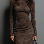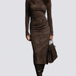 Šaty Catarina Midi ve tmavě hnědé barvě přinášejí dokonalou kombinaci sofistikovaného stylu a pohodlí. Vyrobené z luxusního semišového materiálu, mají přiléhavý střih, který krásně zvýrazňuje postavu. Vysoký límec a dlouhé rukávy dodávají elegantní a moderní vzhled, zatímco délka šatů ke kotníkům je ideální pro každou příležitost. Tento model je perfektní pro chladnější dny, kdy chcete vypadat stylově, ale zároveň se cítit pohodlně.