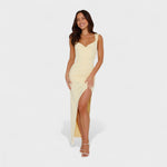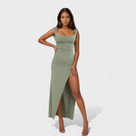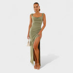 Šaty Constança redefinují sofistikovanost svým drapovaným výstřihem a otevřenými zády s mašlí. S přiléhavým střihem, který prodlužuje postavu, a bočním rozparkem pro volnost pohybu, jsou ideální pro zvláštní příležitosti, kde chcete zazářit.