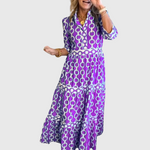 Tyto košilové šaty kombinují klasický a současný design. Díky límci a zapínání na knoflíky vyzařují eleganci, zatímco výrazný vzor jim dodává dynamický a moderní vzhled. S tříčtvrtečními rukávy a zúženým pasem nabízejí ženskou siluetu a pohodlí po celý den. Ideální pro práci, městské procházky nebo večerní výlety.