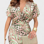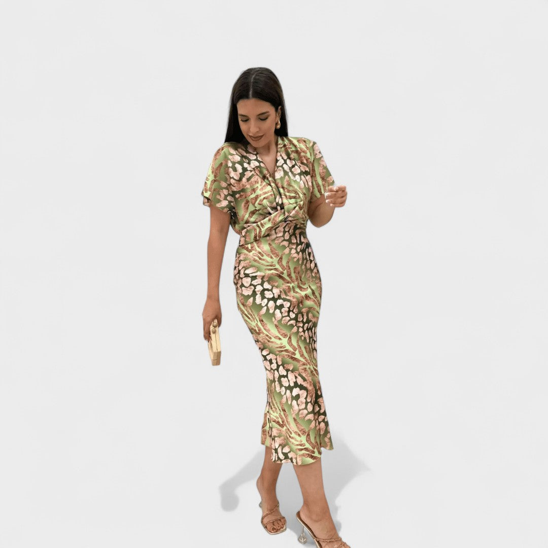 Elegantní midi šaty s volnými rukávy a draped V-výstřihem, který jemně zvýrazňuje dekolt. Tkanina s jemným leskem a dekorativním vzorem elegantně splývá přes tělo, zatímco definovaný pas utváří ženskou siluetu. Mírně rozšířený lem umožňuje půvabný pohyb — ideální na svatby, koktejly a všechny speciální příležitosti.