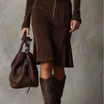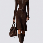 Šaty Catarina Midi zosobňují sílu, půvab a vytříbený styl v dokonale vyvážené formě. Vyrobené z měkké tkaniny s efektem semiše přinášejí strukturu i jemnost v jednom. Přiléhavý střih se zapínáním na zip zvýrazňuje postavu, zatímco ladící pásek opticky zužuje pas a dodává šatům precizní tvar. Délka ke kolenům a dlouhé rukávy zajišťují elegantní, sebevědomý vzhled vhodný pro každou příležitost.