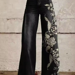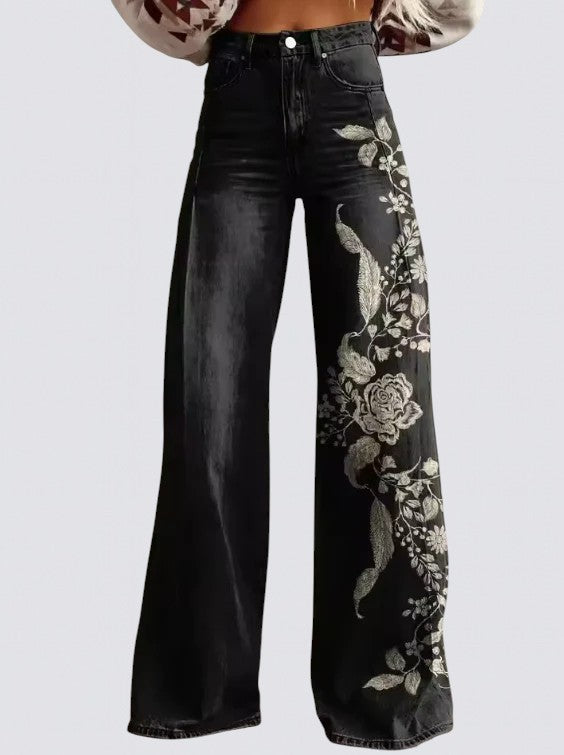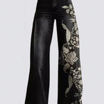 Vintage kalhoty ELEONORA · vyzařují jemnou sílu s každým krokem. S elegantní květinovou výšivkou, která kaskádovitě splývá po noze, tento kousek spojuje temný denimový styl a romantické detaily — pro vzhled, který je stejně divoký jako elegantní.