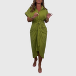 Tyto šaty kombinují klasickou eleganci s moderním designem. Košilový styl s límečkem a knoflíky, doplněný výrazným páskem v pase, vytváří lichotivou siluetu a zvýrazňuje ženskost. Měkký materiál poskytuje pohodlí a midi délka je ideální volbou pro pracovní příležitosti, večerní výlety nebo formální akce.