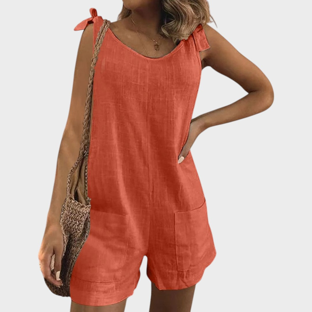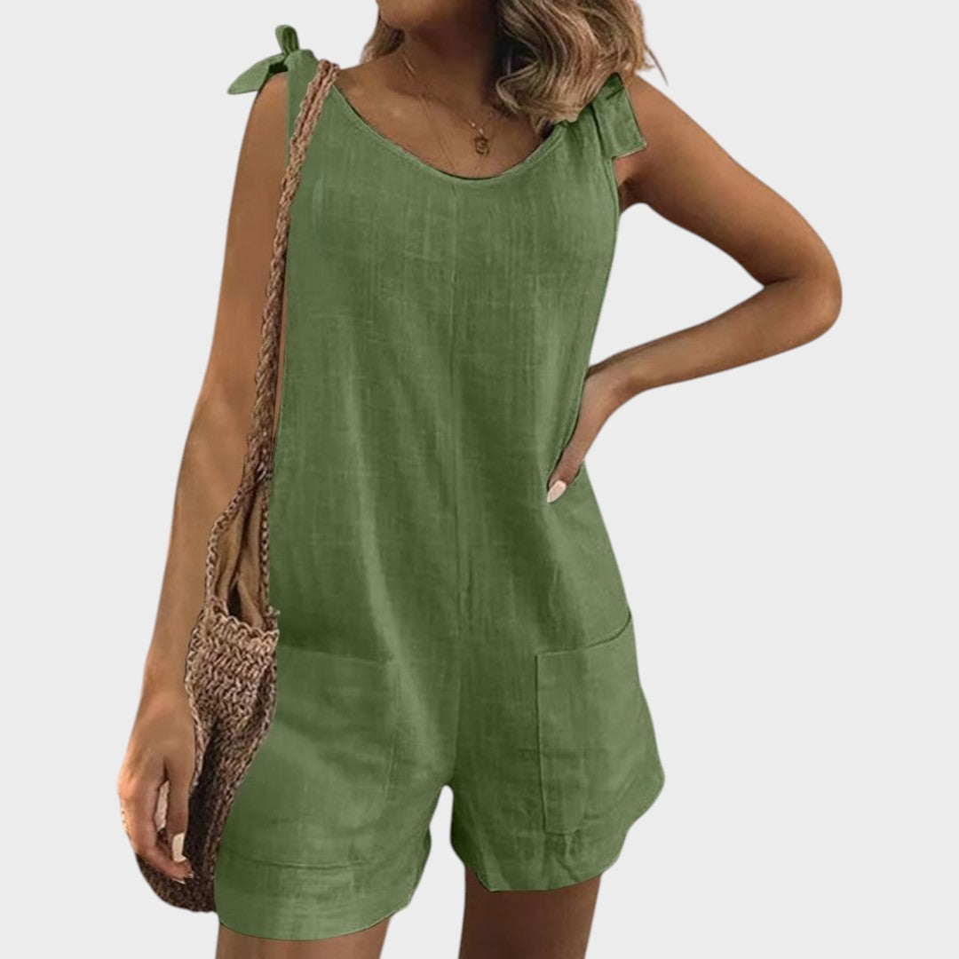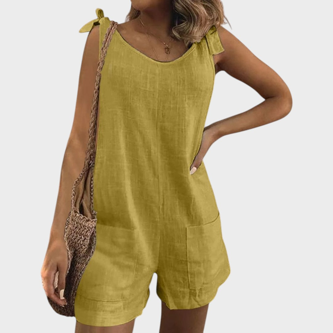 Tento lehký overal je ideální volbou pro teplé dny a uvolněné příležitosti. S moderním bezramenným střihem, praktickými kapsami a ženskými ramenními tými nabízí kombinaci pohodlí a stylu, která vás provede od rána do večera.